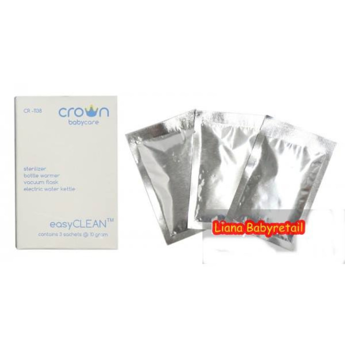 isi 10 gram - 3 Pack adalah bubuk pembersih kerak membandel yang sulit dibersihkan pada sterilizer, penghangat botol, dan pemanas air listrik. Bubuknya berupa kristal citric acid (Asam cuka) yang murni dan sesuai dengan standar keamanan bagi makanan (patent dari Jerman)