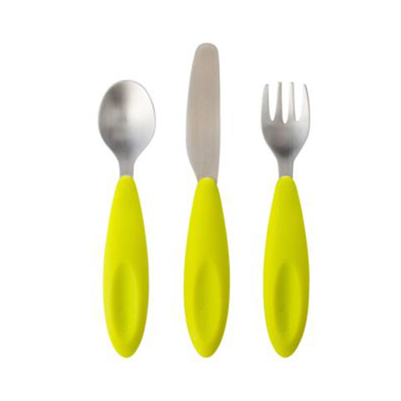 Boon 11019 Flatware Transitional Utensils Set Alat Makan - Green adalah perlengkapan makan berupa sendok, garpu dan pisau sebagai alat transisi bagi anak yang menginjak dewasa sebelum menggunakan sendok, garpu dan pisau yang dipakai orang dewasa. Terbuat dari silikon food grade dan stainless steel Aman untuk mesin pencuci piring BpA-free, Phthalate-free and PVC-free dan mempunyai pegangan yang mudah dipegang oleh si kecil, ujung pisau yang di desain membulat agar tidak menyakiti si kecil. Perlengkapan makan ini untuk anak usia 18 bulan ke atas.