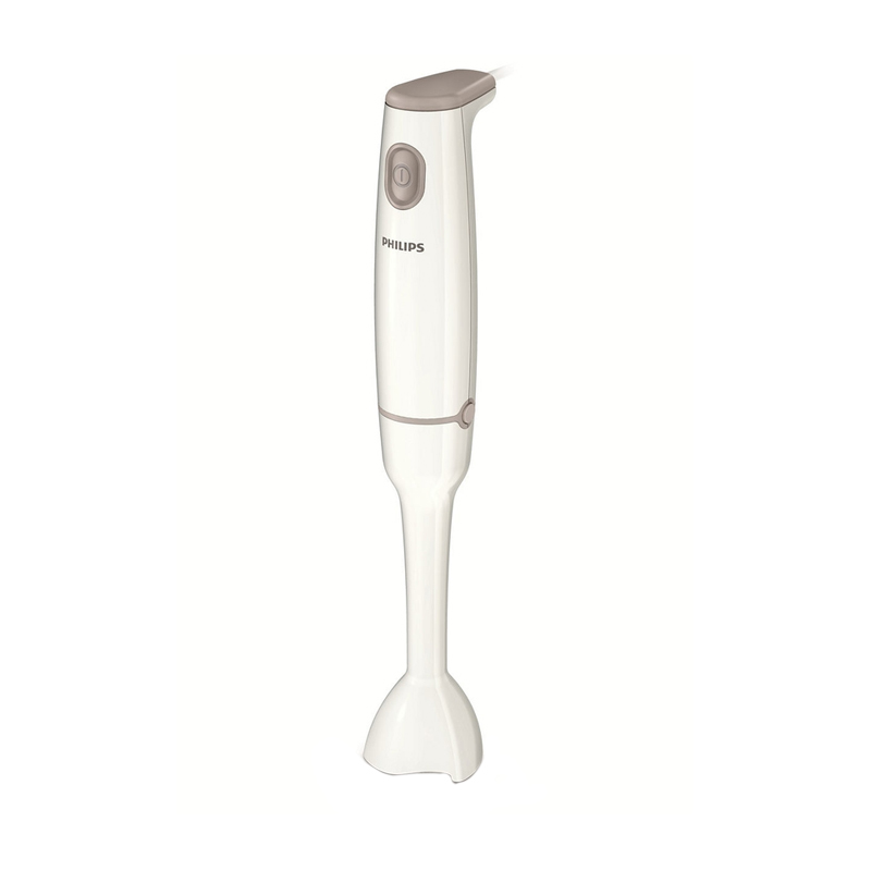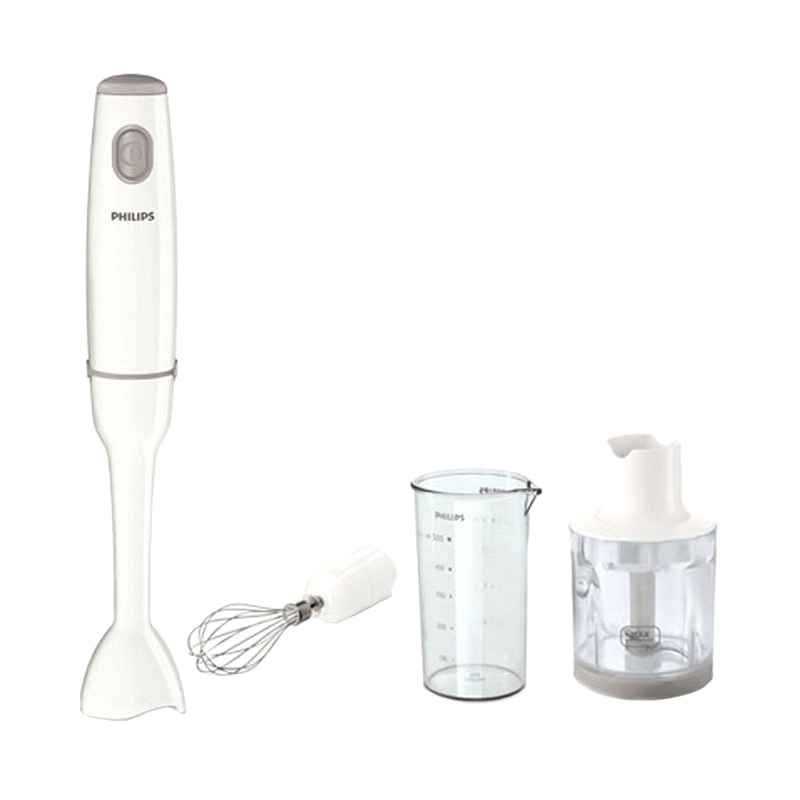 Cukup tekan dan tahan tombol On-Off untuk proses pencampuran bahan makanannya. Desain pegangannya disesuaikan dengan bentuk tangan pada umumnya sehingga nyaman digunakan. Satu set blender Philips ini berisi alat alat pengocok, pengaduk, wadah pencampur, dan chopper.