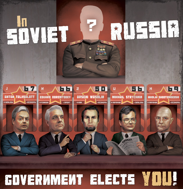 At the start of the game, the players secretly note influence on ten politicians, graded from 10 (most) to 1 (least). Gameplay is not clockwise, but happens from top to bottom in the politburo. Whatever action the politician in a certain office can take is done by the player who reveals the greatest influence on the politician in question. Actions include accusing other politicians of espionage (potentially exiling them to Siberia), pardoning them, reshuffling the politburo and others. But each action a politician takes lets him (or in one case, her) age by one or more years. Once a turn each politburo member must face a health roll which can result in sickness marker or even instant death (the older, the most likely). At the end of each turn, the reigning head of state must wave to the crowd at the October parade without collapsing (which gets harder the sicker the politician is). A politician who succeeds in this three times makes the player who controls him/her the winner.