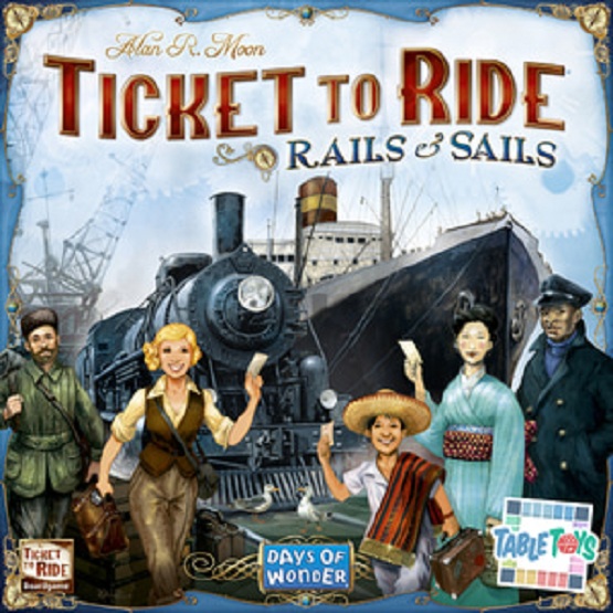 Ticket to Ride: Rails & Sails puts a few twists on the TTR formula, starting with split card decks of trains and ships (with all of the wild cards going in the train deck). Three cards of each type are revealed at the start of the game, and when you draw cards,